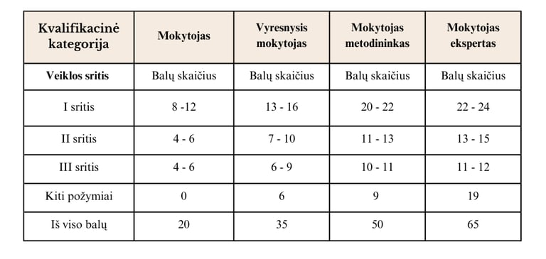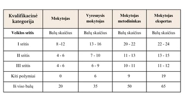 Mokytojui, pretenduojančiam įgyti atitinkamą kvalifikacinę kategoriją privalu surinkti lentelėje nurodytą balų skaičių.