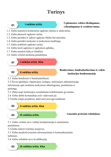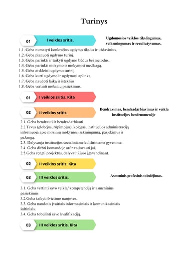 I sritis yra apie Jūsų vedamas pamokas, bendrųjų programų įgyvendinimą, ilgalaikius ugdymo planus, taikomus metodus, mokinių vertinimą.